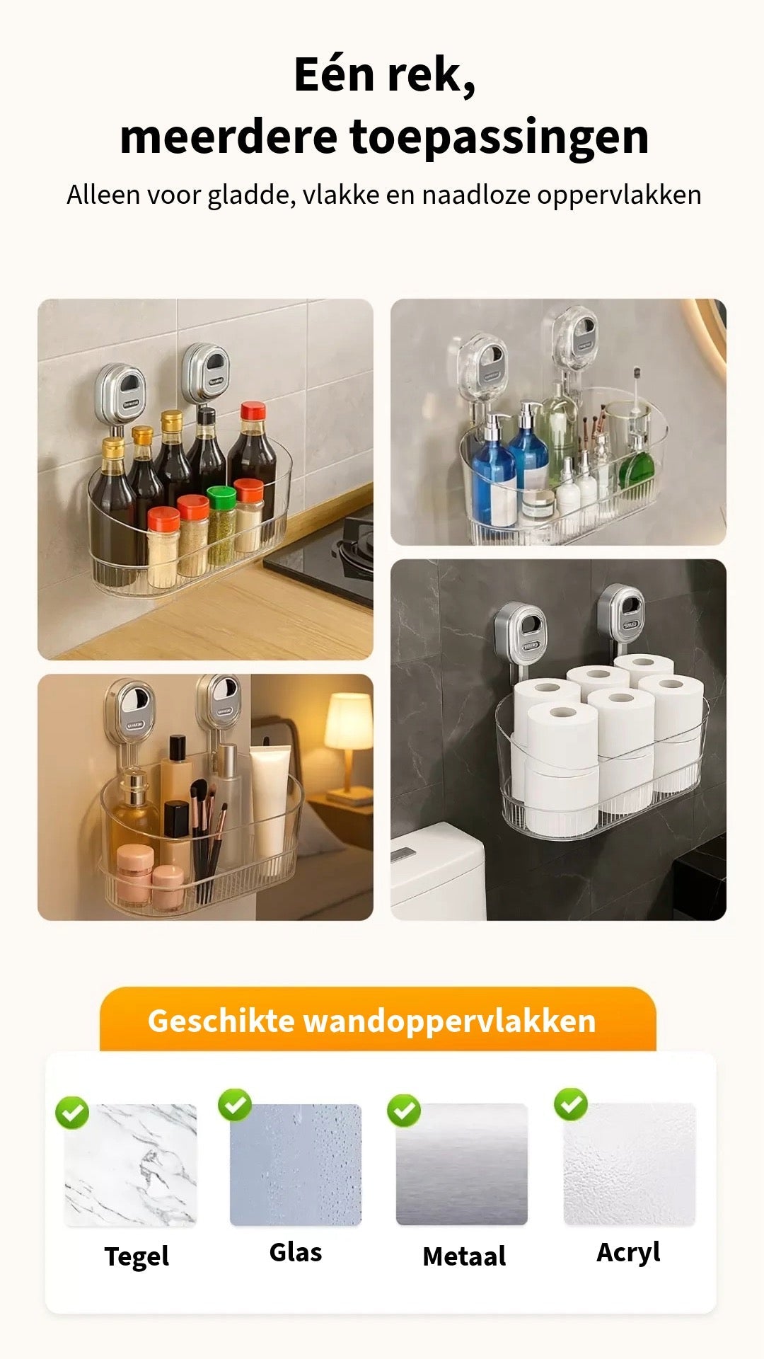 Met het Opbergrek met Zuignap verlies je nooit meer tijd aan rommelige keukens of badkamers. Dankzij de eenvoudige installatie zonder gereedschap bevestig je het rek in enkele seconden op elke gladde ondergrond. Een slimme, duurzame oplossing om je ruimte netjes, veilig en hygiënisch te houden.