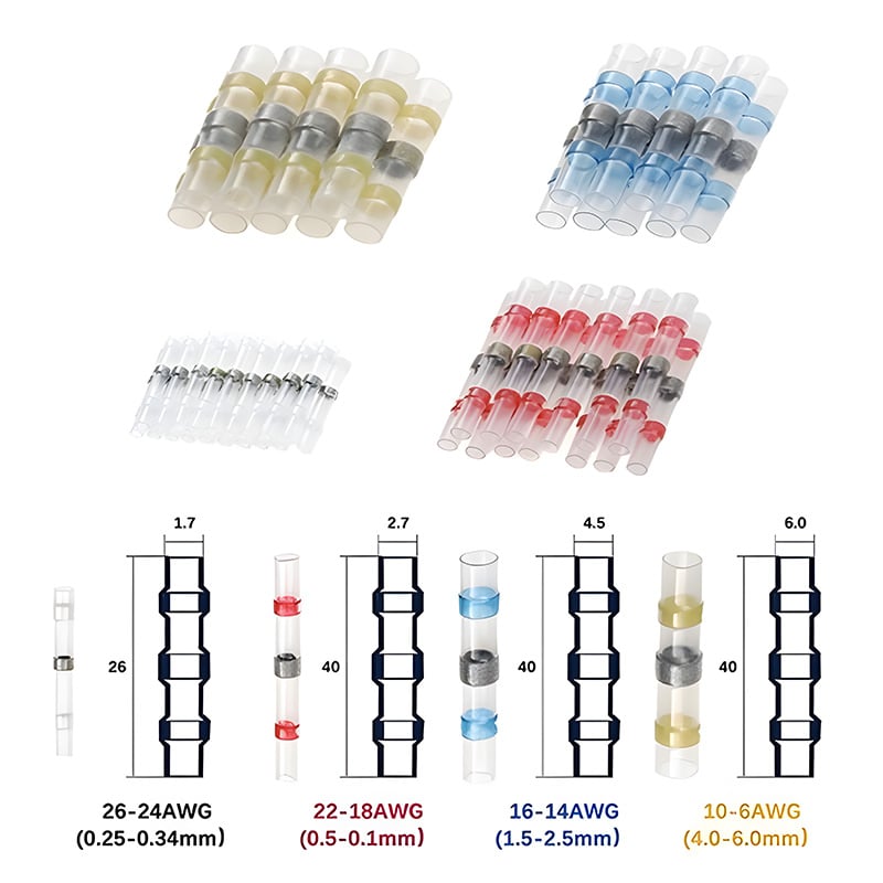 4 verschillende kleuren buizen met gemakkelijk herkenbare maatstreepjes, u hoeft alleen maar de bedrading te meten om snel de juiste connector te kiezen.